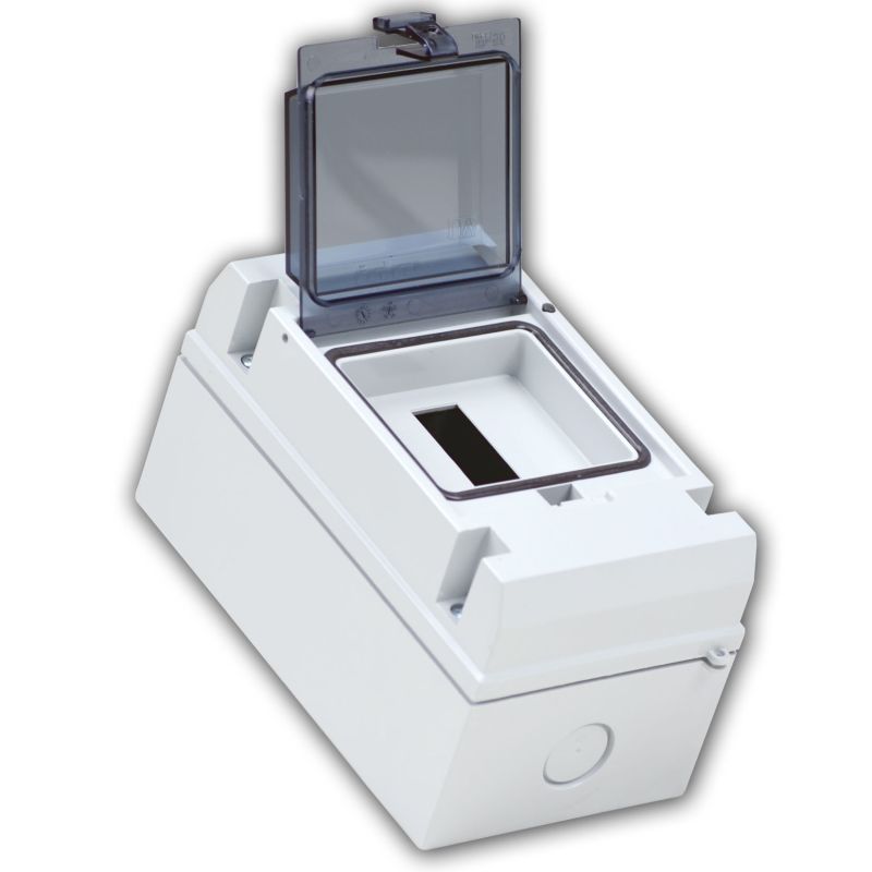 4 way weatherproof modular enclosure, IP55 rated, complete with transparent reversible door.