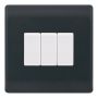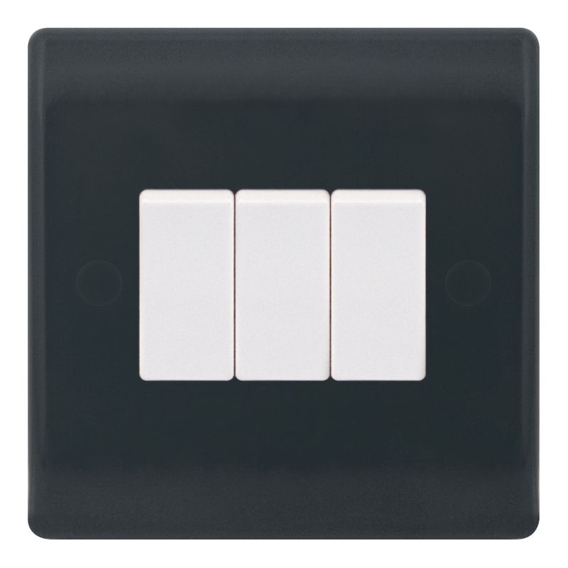 Part M compliant 10A plate switch, 3 gang 2 way, X-rated. Smooth grey finish designed for accessible and compliant electrical installations.