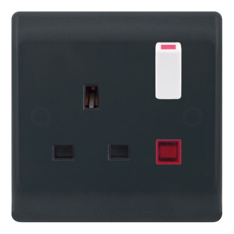 Part M compliant 13A double pole switched socket with neon indicator. Smooth grey 1 gang plate with white rockers for accessible installations.