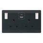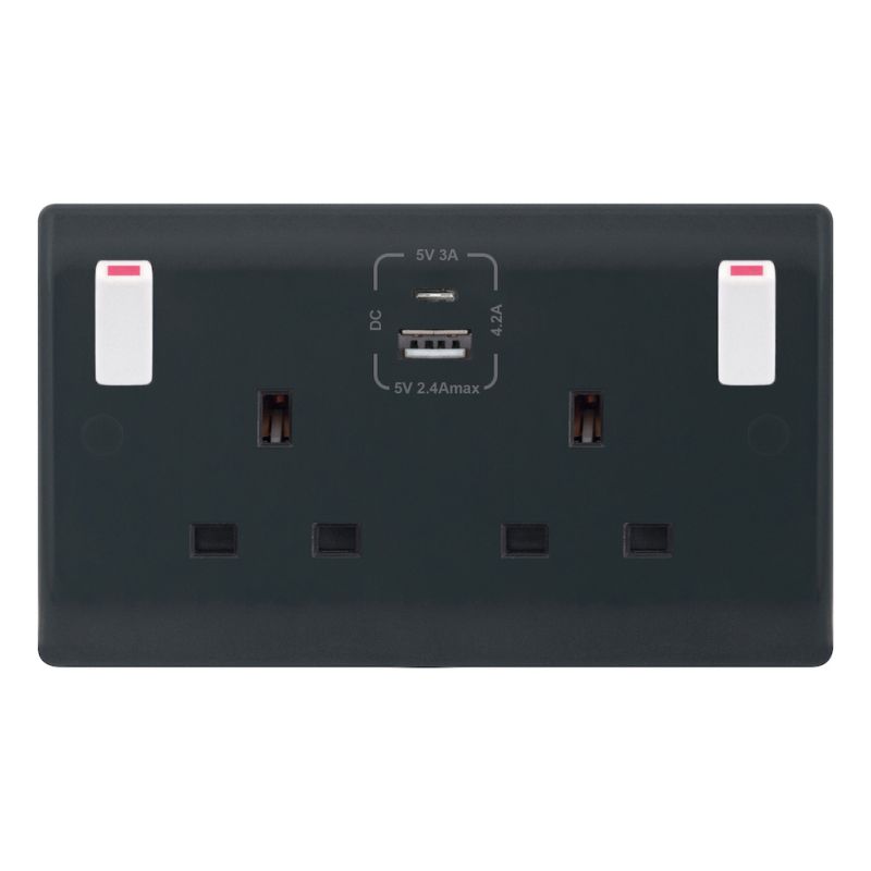 Part M compliant 13A 2 gang switched socket with USB-A & USB-C (2.4A / 3A). Smooth grey finish with outboard rockers for accessible installations.