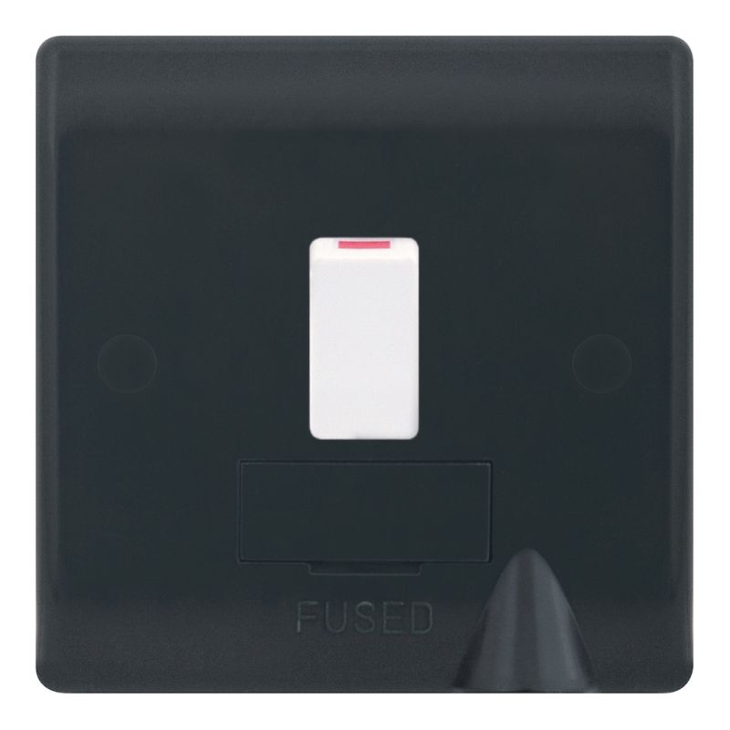 Part M compliant 13A switched fused connection unit with bottom flex outlet. Smooth grey finish with white rockers for accessible installations.