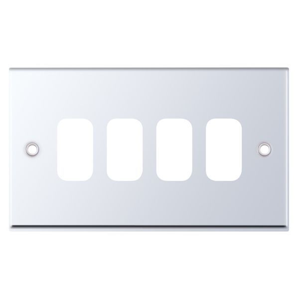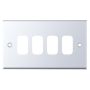 Polished chrome 4 aperture modular plate from the Selectric GRID360 7M-PRO range. Compatible with GRID360 modules and dimmer cover plates.