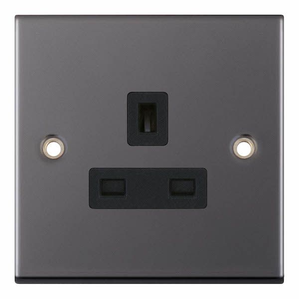 The Selectric 1 Gang 13 Amp Unswitched Socket is finished in black nickel with a black insert. Designed to accommodate a standard UK 3-pin plug, this socket provides a clean, minimalist look by omitting a local power switch, making it ideal for appliances that stay permanently connected or are controlled elsewhere.