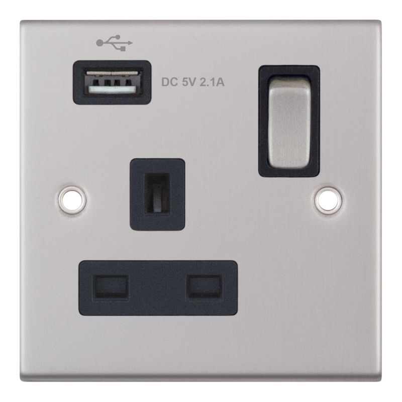 1 Gang 13 Amp Socket w/ USB Port SP Switched Black Insert Selectric Sockets Satin Chrome
