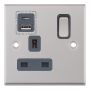1 Gang 13 Amp Socket w/ USB Type C & A Ports Grey Inserts Selectric Sockets Satin Chrome