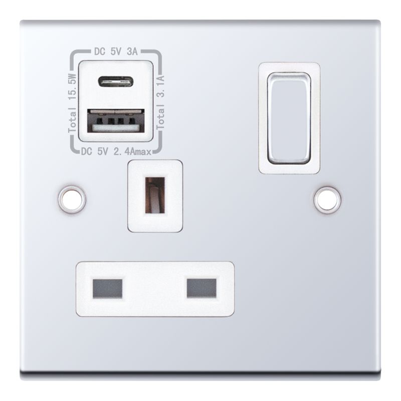 1 Gang 13 Amp Socket with 1 x USB Type C & 1 x USB Type A Port (3.1A) White Selectric Sockets Polished Chrome