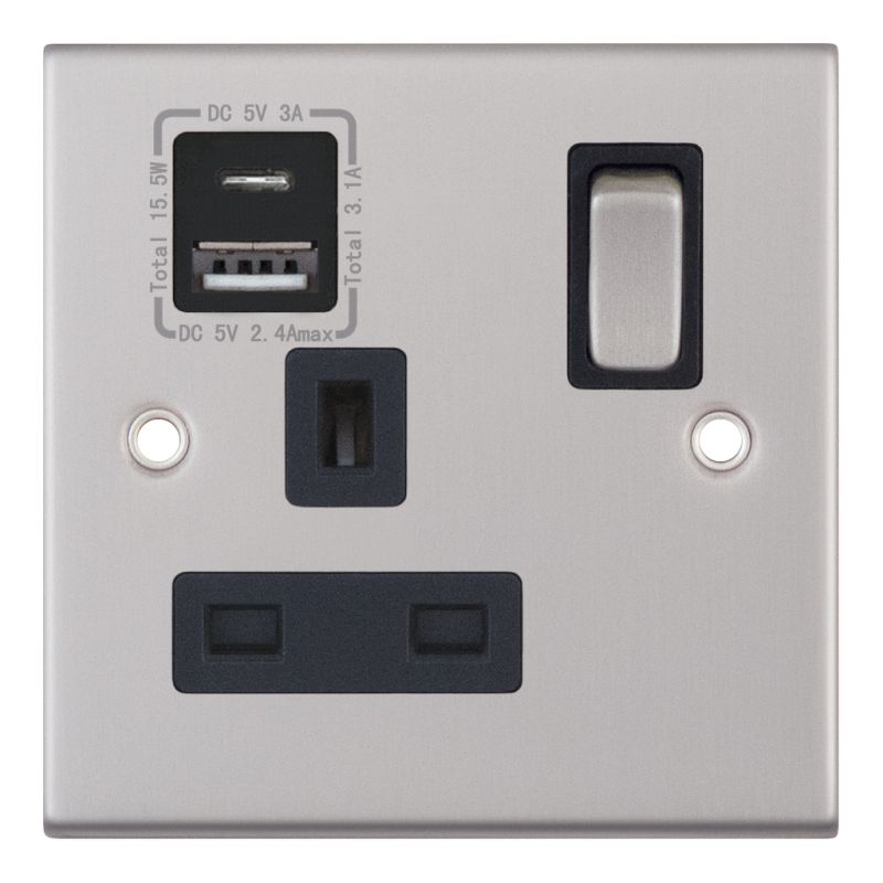 1 Gang 13 Amp Socket with 1 x USB Type C & 1 x USB Type A Port (3.1A) Black Insert Selectric Sockets Satin Chrome