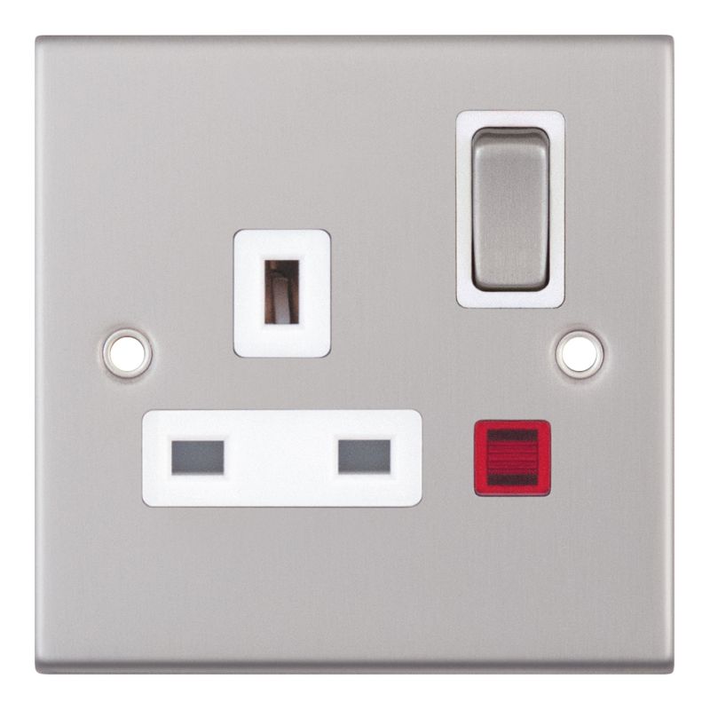 1 Gang 13 Amp Socket with Neon DP Switch White Insert Selectric Sockets Satin Chrome
