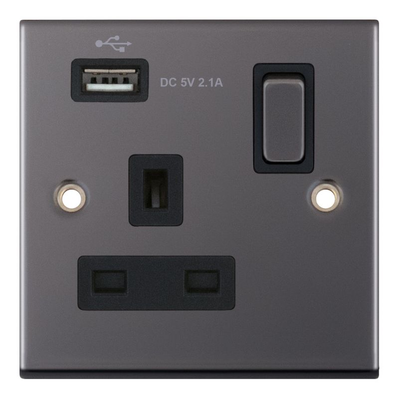 1 Gang 13 Amp Socket with USB Port SP Switched Black Insert Selectric Sockets Black Nickel