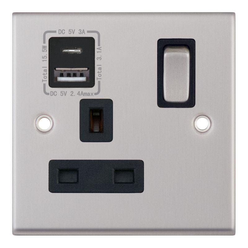 1 Gang 13A Socket1 x USB Type C & USB Type A Port (3.1A) Selectric Sockets Satin Chrome