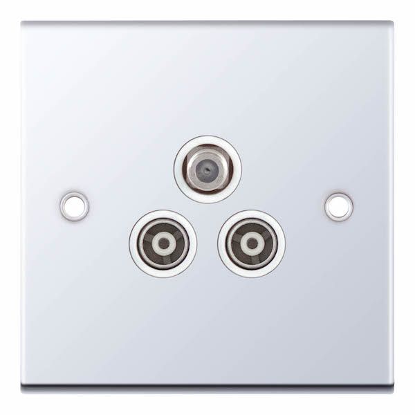 1 Gang F-Type Satellite + 2 Gang TV/FM Coaxial/Aerial Sockets Isolated White Inserts Selectric TV Points Polished Chrome