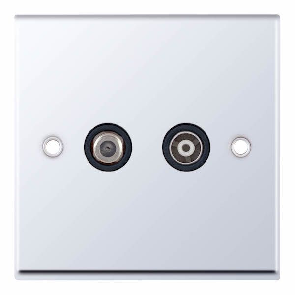 This is the Selectric 1 Gang F-Type Satellite Socket + 1 Gang TV/FM Coaxial/Aerial Socket Isolated Polished Chrome Black Inserts.