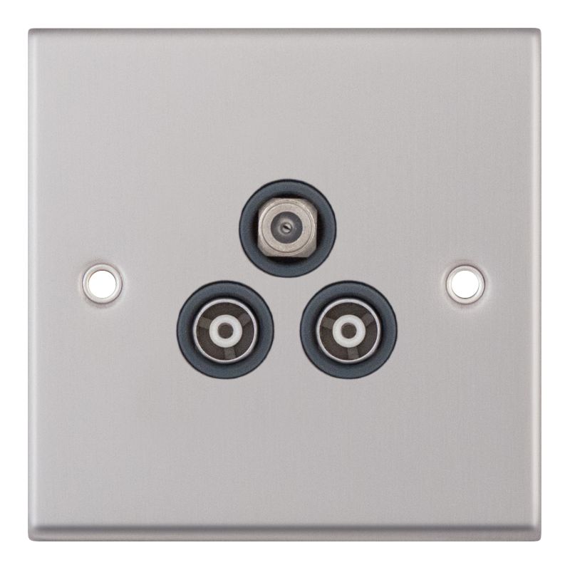This is the Selectric 1 Gang F-Type Satellite Socket with 2 Gang TV/FM Coaxial/Aerial Sockets in Satin Chrome with Grey Inserts. Suitable for use with VHF, UHF and cable TV signals, it provides dedicated connections for satellite and multiple television or FM feeds within a single, coordinated plate.