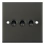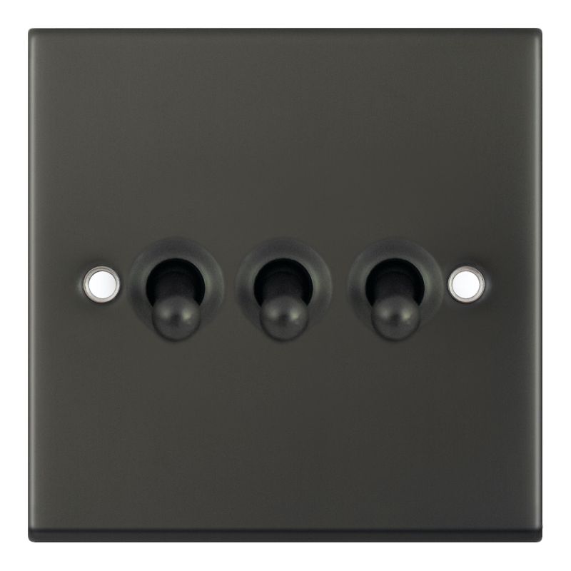 The Selectric 10 Amp 3 Gang 2 Way Toggle Switch features a dark bronze finish, providing a vintage aesthetic for controlling three separate light circuits from a single plate. Each of the three toggles supports 2-way functionality, allowing for versatile lighting configurations where lights can be operated from multiple locations. This switch is compatible with the Modular and Euro Media range to ensure a uniform look throughout an installation and requires a minimum backing box depth of 35mm.