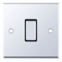 The switch is X-rated for fluorescent or inductive loads, making it suitable for a wide range of lighting installations. It features a matching curved metal rocker for a coordinated finish, while the polished chrome plate with black insert provides a sleek, contemporary appearance. A minimum back box depth of 16mm is required for installation.