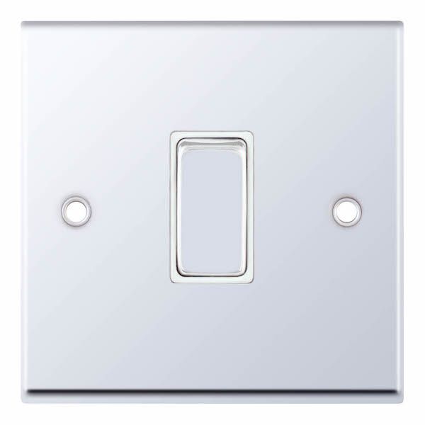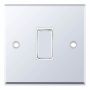 This is the Selectric 10 Amp 1 Gang 2 Way Plate Switch X-Rated in Polished Chrome with White Inserts. ASTA approved for safety and reliability, it is designed for lighting circuits and is X-rated for fluorescent or inductive loads, making it suitable for applications with higher inrush currents.