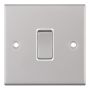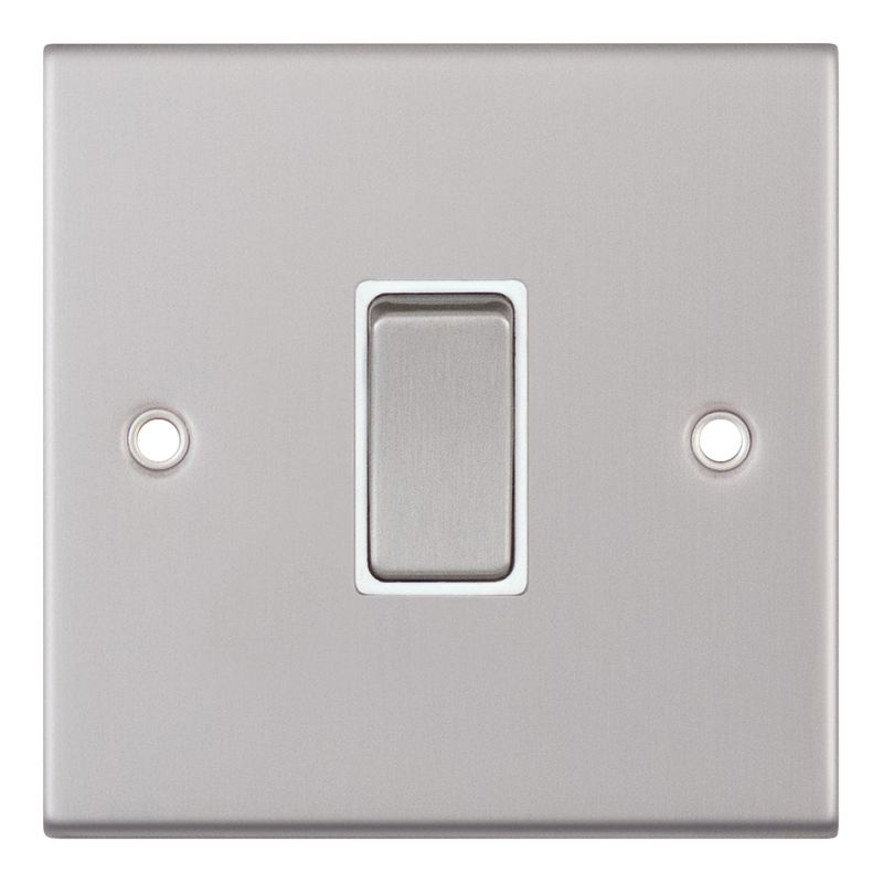 The Selectric 10 Amp 1 Gang 2 Way Plate Switch in satin chrome with white insert combines modern styling with reliable performance. Featuring a matching metal rocker and ASTA approval, it is X-rated for use with fluorescent or inductive loads, ensuring dependable operation. Designed with a sleek finish, it requires a minimum 16mm back box for installation.