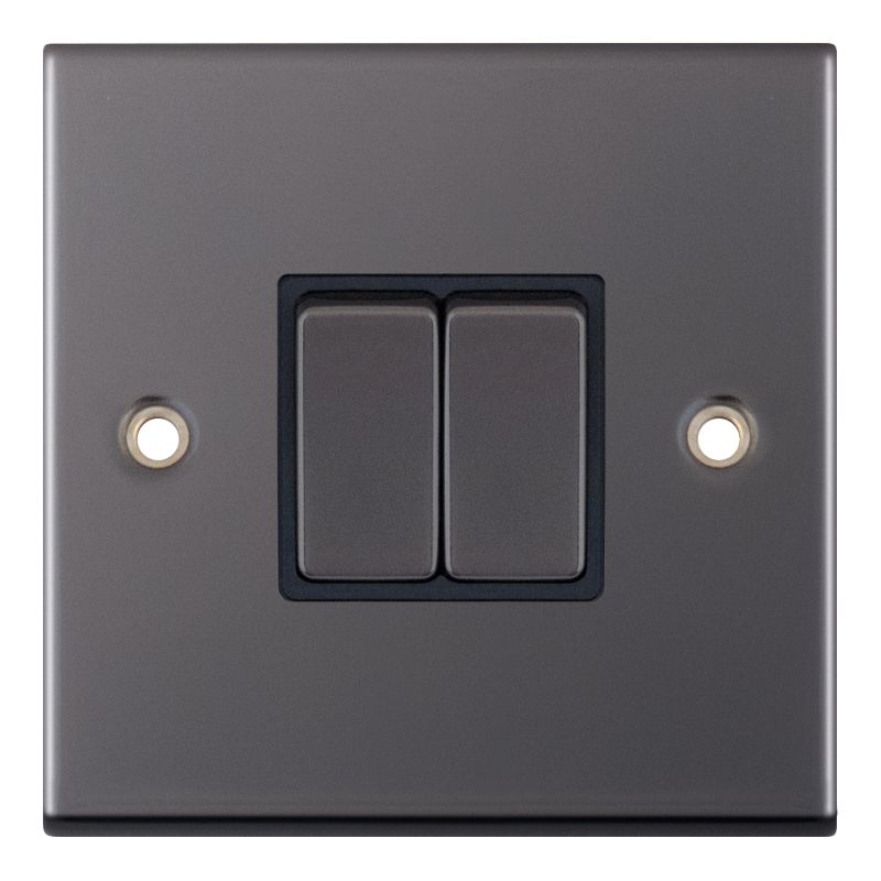 The Selectric 10 Amp 2 Gang 2 Way Plate Switch is finished in black nickel with matching metal rockers and a black insert. ASTA approved and X-rated for fluorescent or inductive loads, this double switch is compatible with the Modular and Euro Media range and requires a minimum back box depth of 16mm.