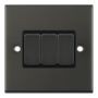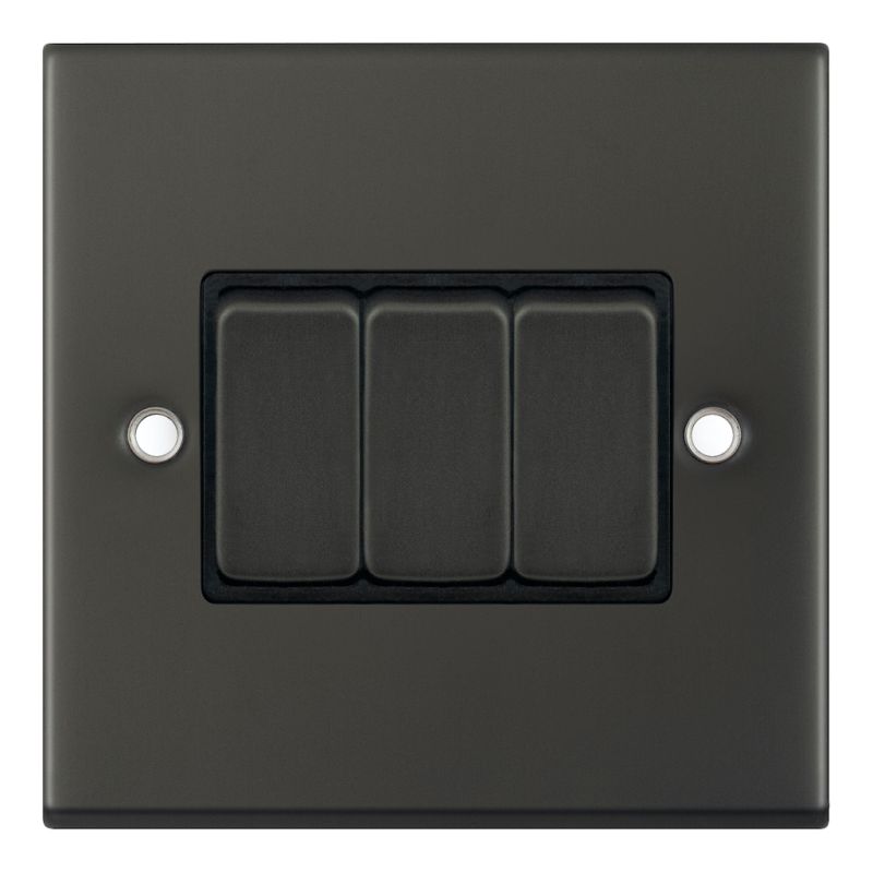 The Selectric 10 Amp 3 Gang 2 Way Plate Switch features a dark bronze finish with matching metal rockers and a black insert. It is ASTA approved and X-rated, which makes it suitable for handling fluorescent or inductive loads.