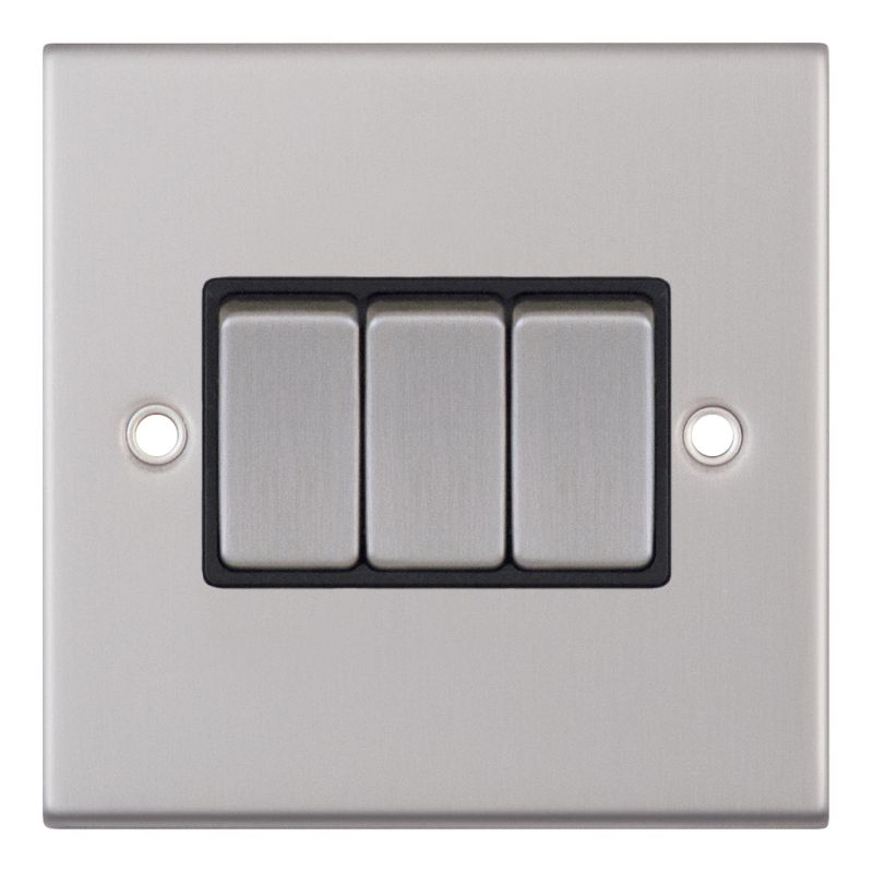The Selectric 10 Amp 3 Gang 2 Way Plate Switch in satin chrome with black insert combines modern design with reliable performance. Featuring matching metal rockers and ASTA approval, it is X-rated for use with fluorescent or inductive loads, ensuring safe and dependable operation. The switch requires a minimum 16mm back box for installation.