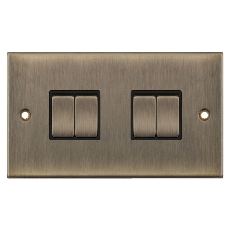 This is the Selectric 10 Amp 4 Gang 2 Way Plate Switch in an Antique Brass finish with black inserts. ASTA approved and X-rated for fluorescent or inductive loads, it is suitable for a wide range of lighting applications. The switch features matching metal rockers for a coordinated appearance and is part of a range that also includes modular and Euro media products. As antique brass is finished by hand, minor variations in colour are to be expected. A minimum back box depth of 16mm is required for installation.