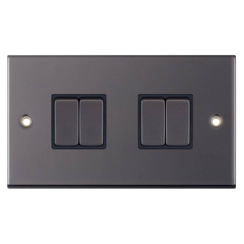 The Selectric 10 Amp 4 Gang 2 Way Plate Switch is finished in black nickel with four matching metal rockers and a black insert. ASTA approved and X-rated for fluorescent or inductive loads, this quad-switch unit is part of the Modular and Euro Media range and requires a minimum back box depth of 16mm.