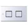 X-rated for fluorescent or inductive loads, it is suitable for a variety of lighting installations. The switch features matching curved metal rockers for a coordinated finish, while the polished chrome plate with black inserts provides a sleek, modern appearance. A minimum back box depth of 25mm is required for installation.