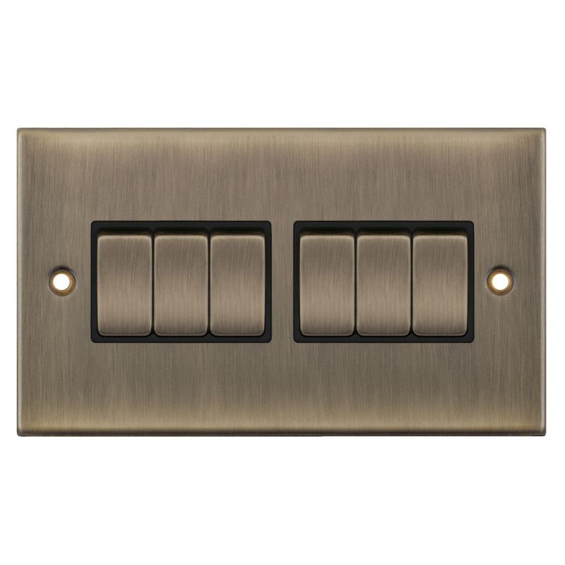 This is the Selectric 10 Amp 6 Gang 2 Way Plate Switch in an Antique Brass finish with black inserts. X-rated for fluorescent or inductive loads, it is suitable for a wide range of lighting applications and features matching metal rockers for a coordinated look. As antique brass is finished by hand, minor variations in colour are to be expected. A minimum back box depth of 25mm is required for installation.
