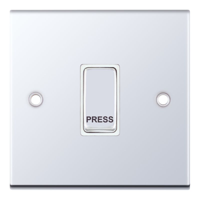 The Selectric 10 Amp 1 Gang Push Switch “PRESS” in polished chrome with white insert combines sleek, modern styling with reliable performance. ASTA approved and featuring a matching metal rocker, it is X-rated for use with fluorescent or inductive loads, ensuring dependable operation. Suitable for a variety of applications, it requires a minimum 16mm back box for installation.
