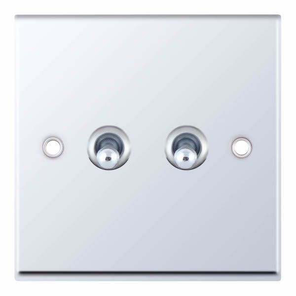 This is the Selectric 10 Amp 2 Gang 2 Way Toggle Switch in Polished Chrome with White Insert. Featuring dual chrome toggles on a polished chrome plate, it provides independent control of two lighting circuits with a stylish, classic appearance. The 2 way switching function allows each light to be controlled from two different locations, making it ideal for hallways, staircases, or larger rooms. A minimum back box depth of 25mm is required for installation.