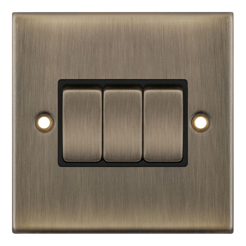 This is the Selectric 10 Amp 3 Gang 2 Way Plate Switch in an Antique Brass finish with black inserts. ASTA approved and X-rated for fluorescent or inductive loads, it is suitable for a wide range of lighting applications. The switch features matching metal rockers for a coordinated look and is part of a range that also includes modular and Euro media products. A minimum back box depth of 16mm is required for installation.