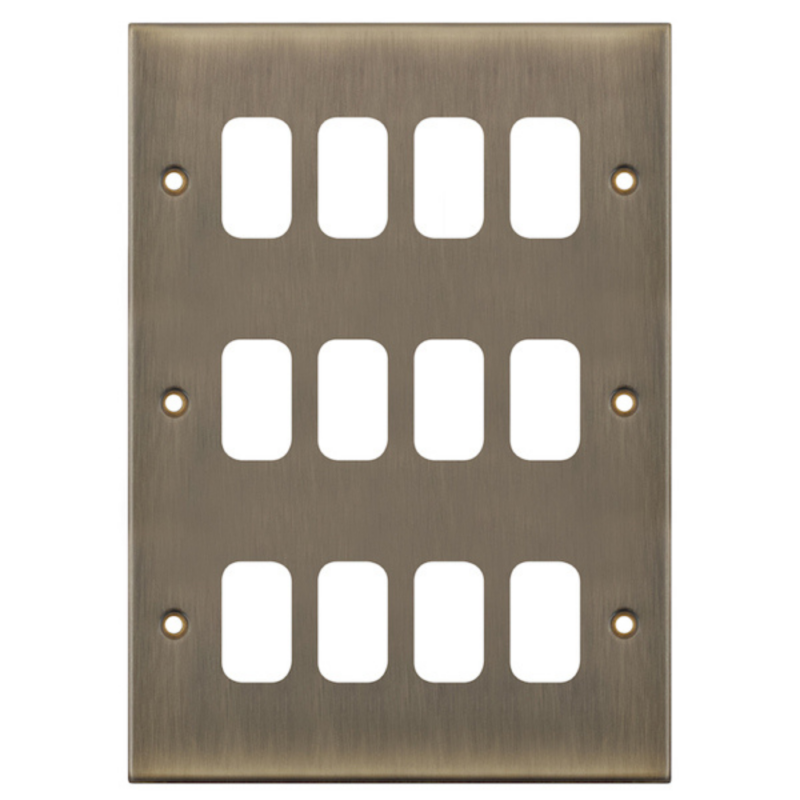 The Selectric 12 Aperture Modular Plate in Antique Brass (5M) is part of the Grid 360 range, providing a highly versatile and elegant solution for extensive modular installations. Designed to hold up to twelve modules, it allows for complete customization of switches and sockets to suit complex electrical layouts.
