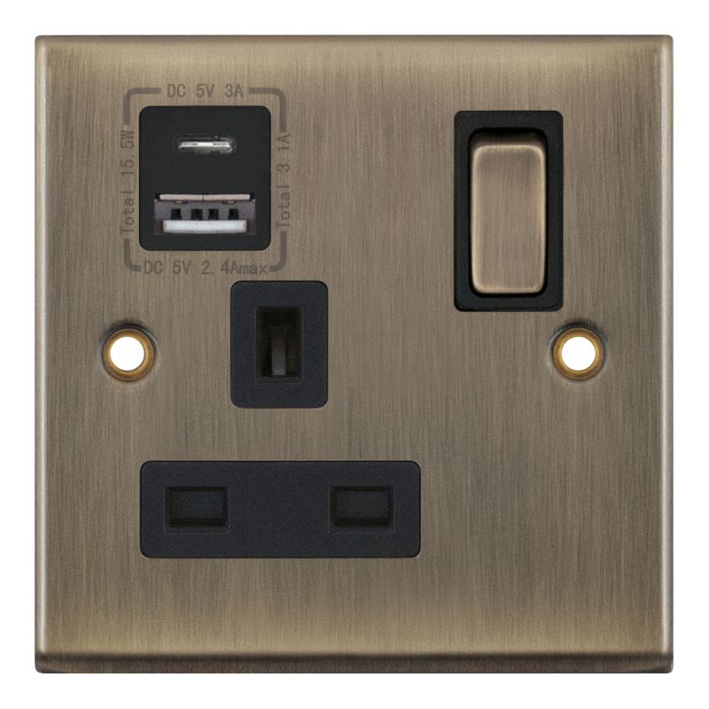13 Amp 1 Gang Socket USB Type C & A Black Insert Selectric Sockets Antique Brass