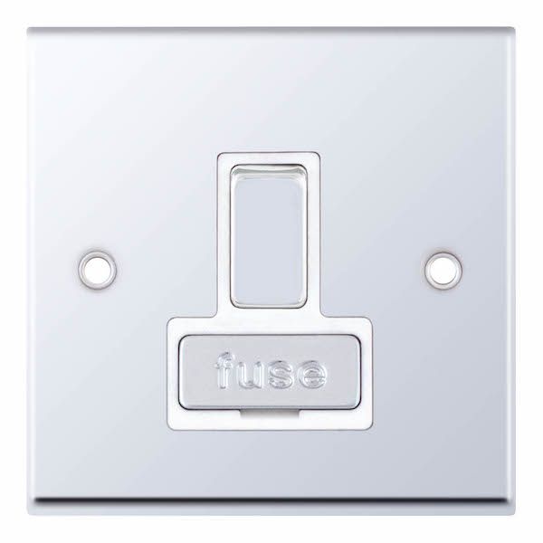 Featuring a matching metal rocker and fuse cover, it provides secure switching and a coordinated, professional finish. The polished chrome plate delivers a sleek, contemporary appearance. A minimum back box depth of 25mm is required for installation.