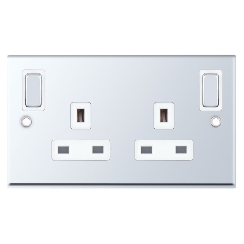 This is the Selectric 13 Amp Socket 2 Gang Switched DP w/ Outboard Rockers Polished Chrome.