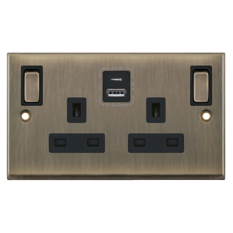 13 Amp Socket 2G Switched SP Outboard Rockers USB Type A & C Selectric Sockets Antique Brass