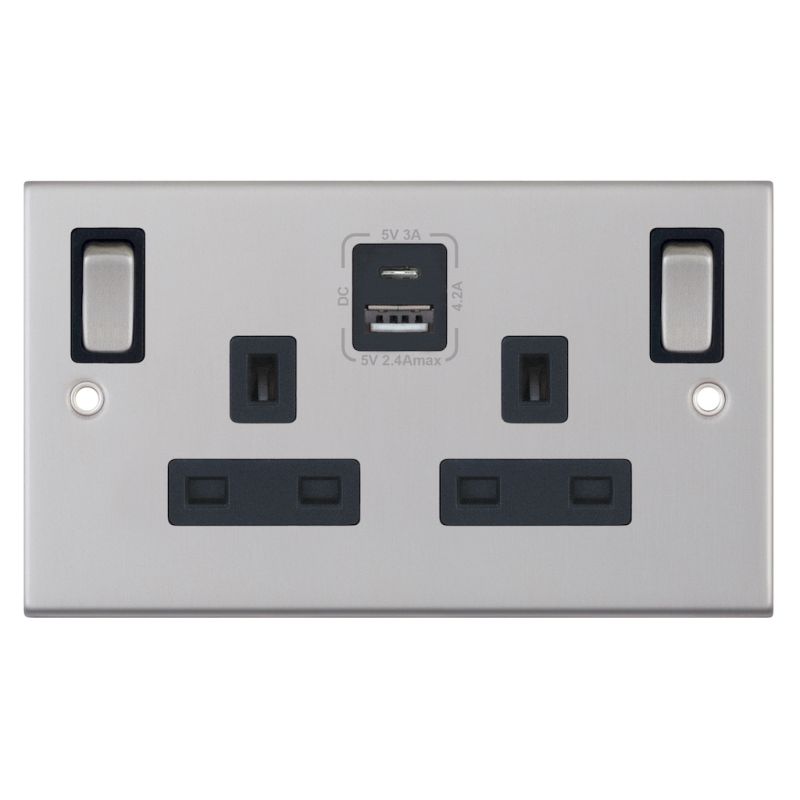 13 Amp Socket Outlet 2 Gang Switched SP Outboard Rockers + 2 Earth Terminals, 1 x USB Type A & 1 x USB Type C (2.4A / 3A) Black Insert Selectric Sockets Satin Chrome