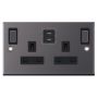 13 Amp Socket Outlet 2 Gang Switched SP Outboard Rockers + 2 Earth Terminals, 2 x USB Type C (3A / 3A) Black Insert Selectric Sockets Black Nickel