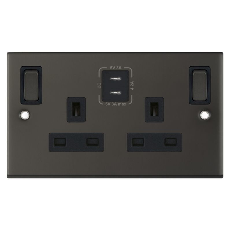13 Amp Socket Outlet 2 Gang Switched SP Outboard Rockers + 2 Earth Terminals, 2 x USB Type C (3A / 3A) Selectric Sockets Dark Bronze