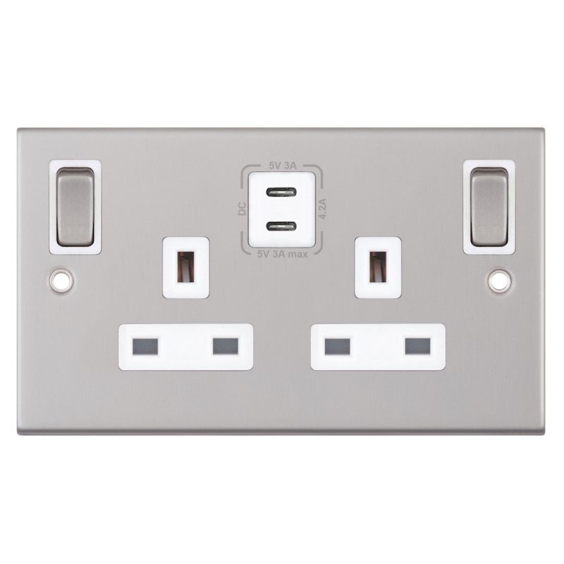 This is the Selectric 13 Amp Socket Outlet 2 Gang Switched SP Outboard Rockers + 2 Earth Terminals, 2 x USB Type C (3A / 3A) Satin Chrome White Inserts.