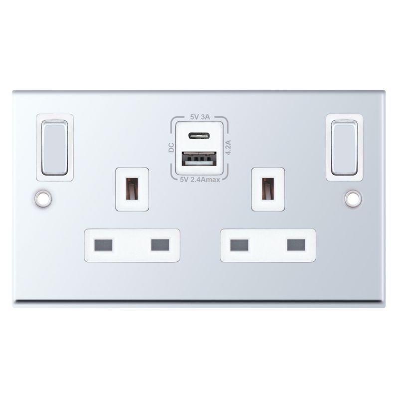 13 Amp Socket Outlet 2 Gang Switched SP Outboard Rockers USB Type A & C Selectric Sockets Polished Chrome