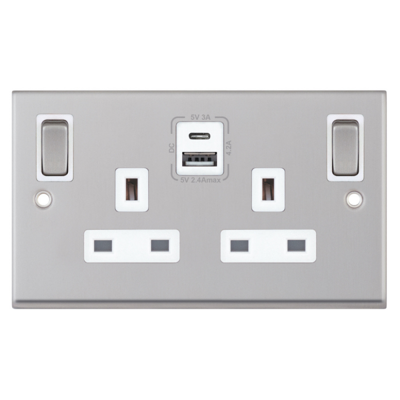 13A Socket 2 Gang Switched SP Outboard Rockers USB Type A & C Selectric Sockets Satin Chrome