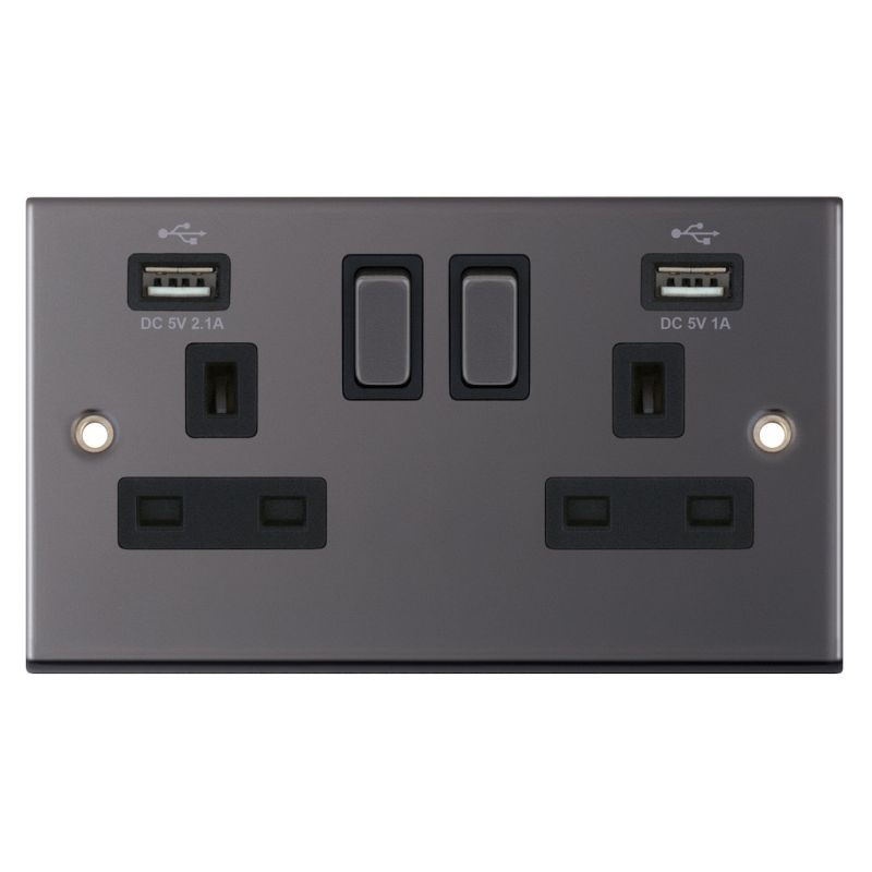 2 Gang 13 Amp Socket 2 x USB Ports SP Switched Black Insert Selectric Sockets Black Nickel