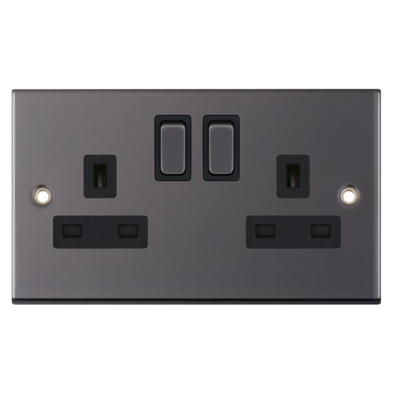 The Selectric 2 Gang 13 Amp Double Pole (DP) Switched Socket features a sleek black nickel finish with matching rockers and a black insert. This unit is ASTA approved, ensuring it meets high safety and quality standards for standard UK 3-pin plug use.