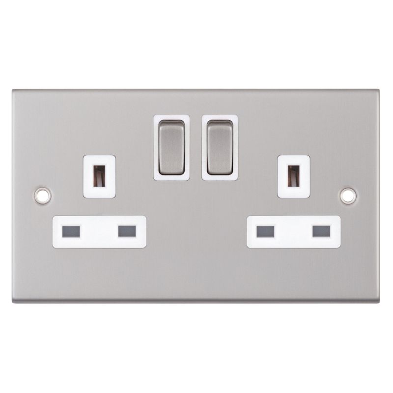 2 Gang 13 Amp Socket DP Switched White Insert Selectric Sockets Satin Chrome