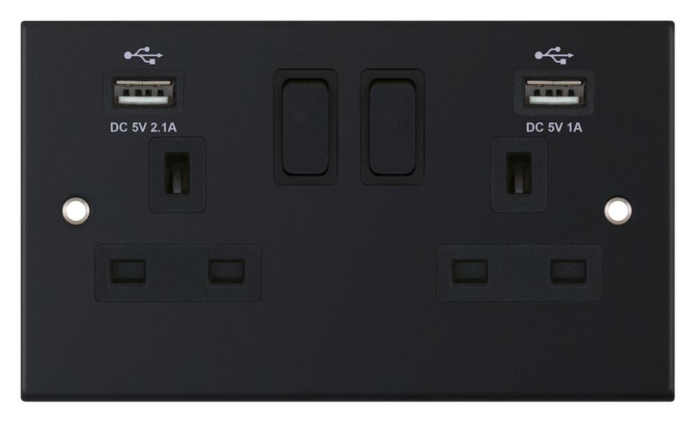 2 Gang 13 Amp Socket USB Ports SP Switched Selectric Sockets Matt Black