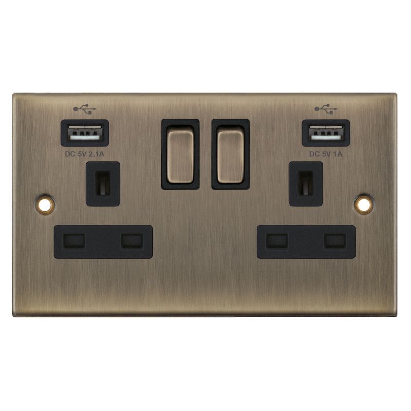 This is the Selectric 2 Gang 13 Amp Socket with USB Ports, Single Pole Switched in an Antique Brass finish with black insert. It features integrated USB outputs of DC 5V 2.1A and DC 5V 1A for convenient charging of multiple devices, alongside standard UK 3-pin sockets. Designed for reliable everyday use, it operates at 0.3A 50Hz ±3Hz. As antique brass is finished by hand, minor variations in colour are to be expected. A minimum back box depth of 35mm is required for installation.