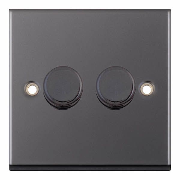 This is the Selectric 2 Gang 2 Way Dimmer Switch 5–100W Push On/Off Black Nickel. It is designed to control two lighting circuits and allows switching from two different locations when used in a 2 way circuit. The dimmer is suitable for both leading and trailing edge LED lamps and supports up to 100W dimmable LED loads as well as up to 150W incandescent or halogen lamps. It provides smooth dimming operation and uses the latest technology to ensure stable performance with no flickering at maximum brightness. Finished in black nickel, it offers a modern and durable appearance. Empty dimmer plates are also available if you wish to install your own dimmer modules. Minimum back box size required: 35mm depth.