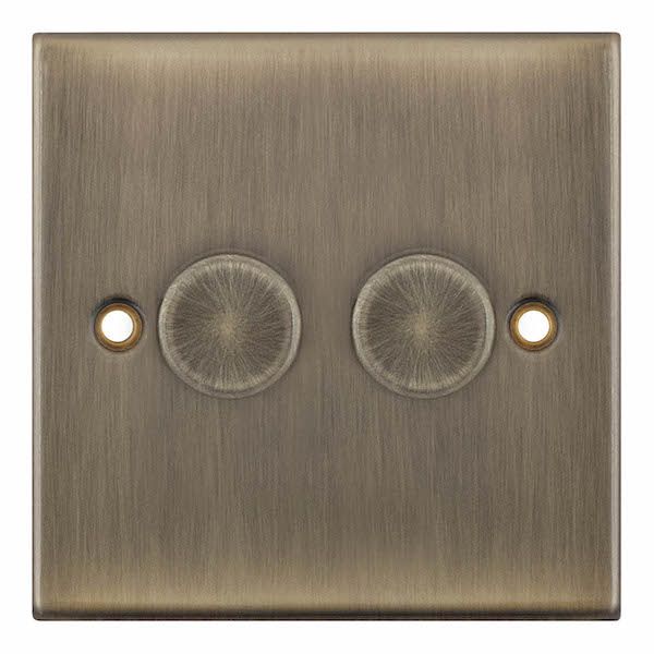 This is the Selectric 2 Gang 2 Way Dimmer Switch 5–100W Push On/Off in an Antique Brass finish. Suitable for use with both leading and trailing edge LED lamps, it provides smooth and reliable dimming control with the latest technology to ensure flicker-free performance, even at maximum brightness. The dimmer supports up to 100W of dimmable LED lighting or 150W of incandescent and halogen lamps and is part of a range where empty dimmer plates are also available to accommodate additional modules. As antique brass is finished by hand, minor variations in colour are to be expected. A minimum back box depth of 35mm is required for installation.