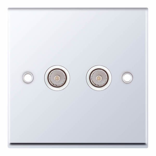 This is the Selectric 2 Gang TV/FM Coaxial/Aerial Socket in Polished Chrome. Suitable for use with VHF and UHF TV signals, it provides dual connection points for television and FM aerial feeds, making it ideal for installations requiring connections to multiple devices or rooms.